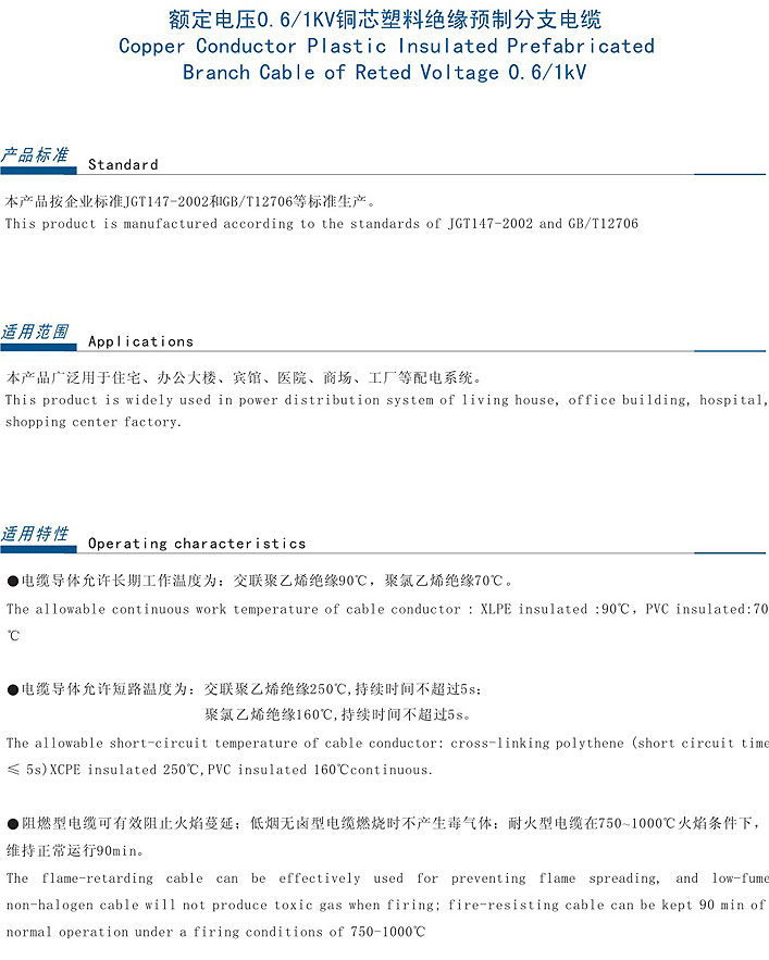 | 額定電壓0.6/1kv銅芯塑料絕緣預制分支電纜 | |